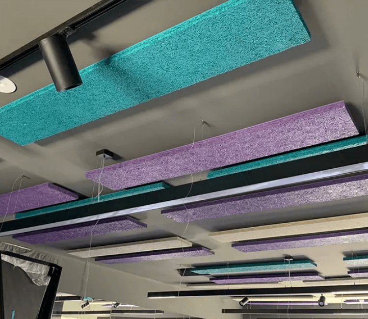 - Open-plan offices, restaurants, cafes, industrial spaces, gyms, auditoriums, large classrooms, lobbies, and any area with high ceilings where reverberation control is needed without fully covering the ceiling.